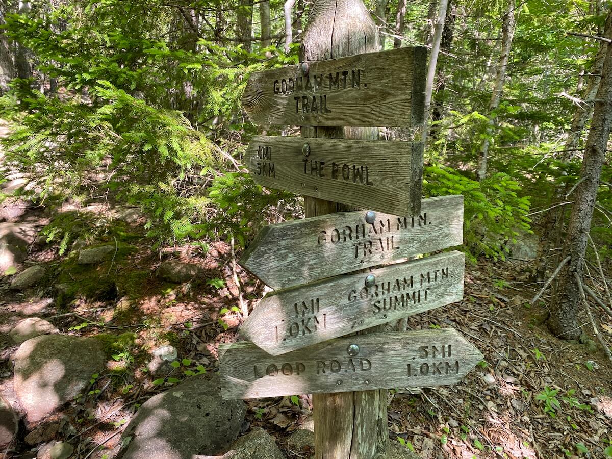 - The hike begins at the southwest corner of the Gorham Mountain parking lot. Look for a large stump with Gorham Mountain trail carved into it.